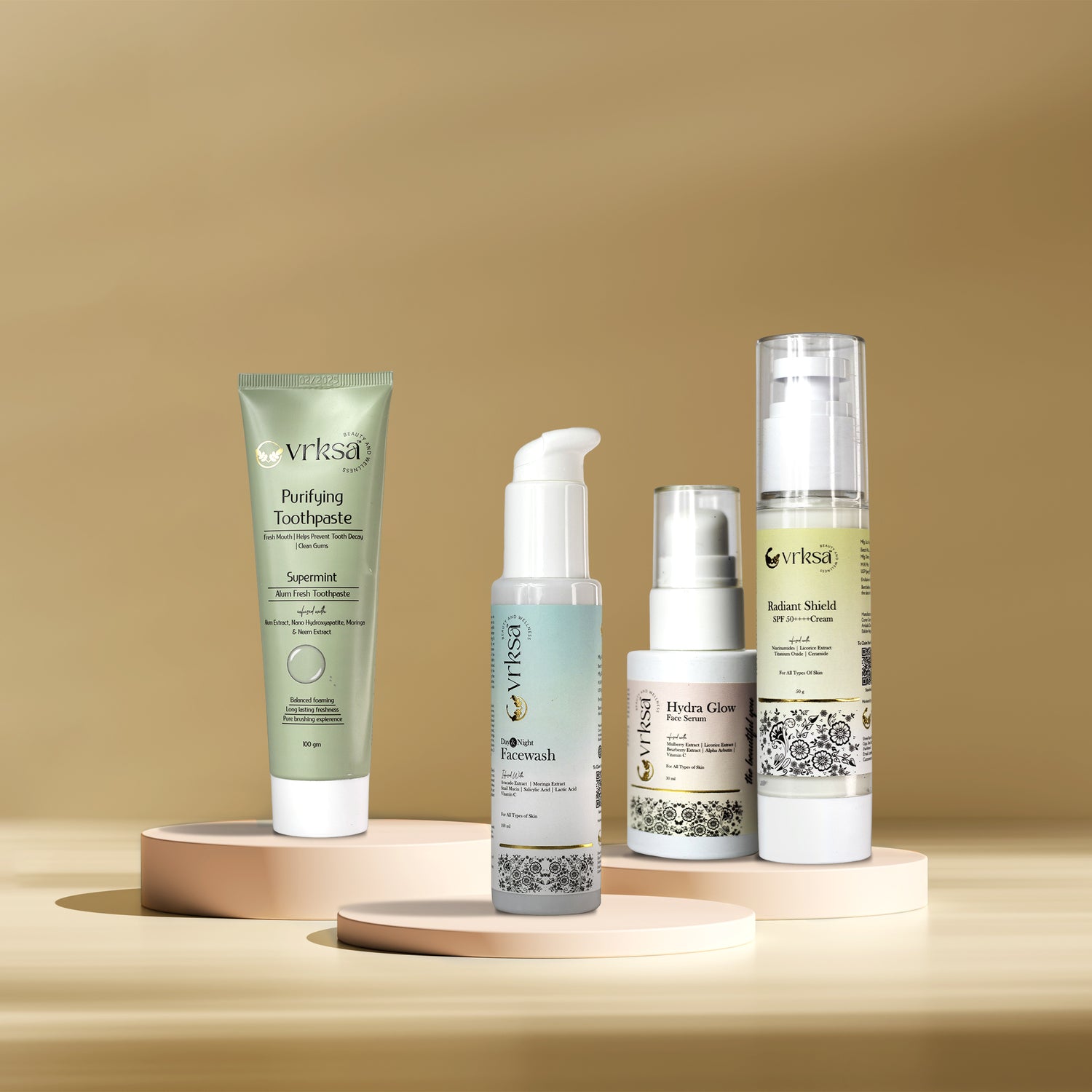 At VRKSA, we are dedicated to reimagining self-care. Our mission is to create extraordinary skincare and oral care products, each crafted with a perfect fusion of nature’s most potent ingredients and cutting-edge science. We aim to enrich your daily rituals, offering a seamless blend of luxury and purpose. Our commitment goes beyond beauty – for every product purchased, a tree is planted, contributing to the restoration of the planet.